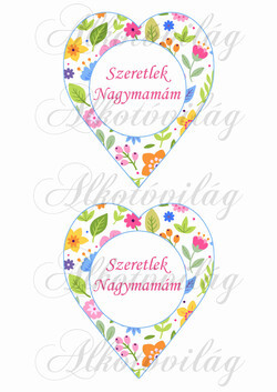 13,5 x 11,5 cm-es szívek vidám, színes apró virágokkal - SZERETLEK NAGYMAMÁM felirattal - Több mint 20 alapanyagon elérhető.