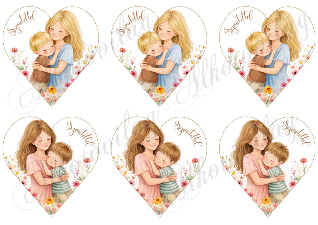 9 cm magas szívek anyukával és kisfiával - SZERETETTEL felirattal - ANYÁK NAPJÁRA