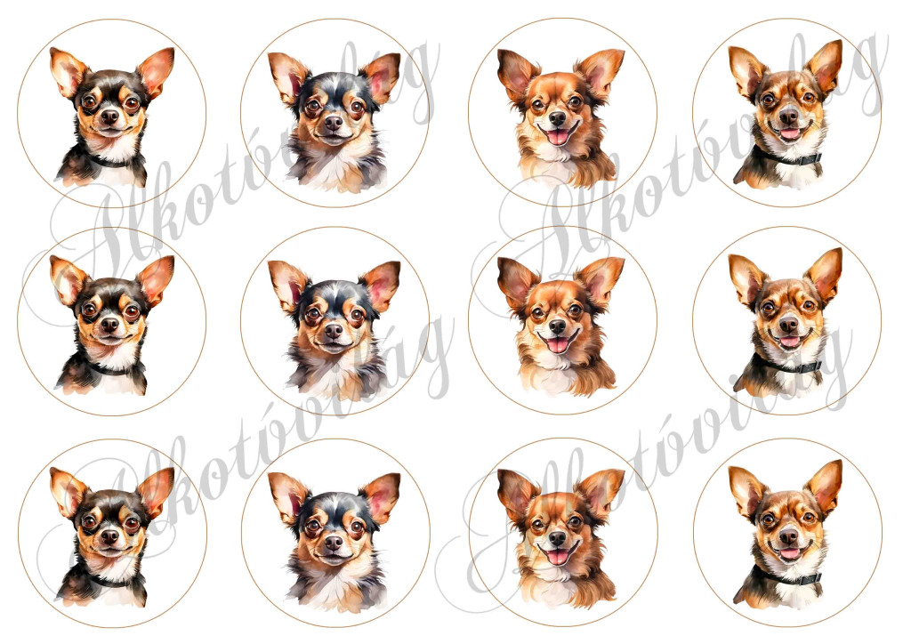 Akvarellel festett csivava kutyusok 6 cm-es körökben