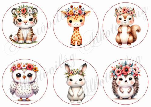 Állatkák vegyesen virágkoszorúkkal 9 cm-es körökben - Több mint 20 alapanyagon elérhető.
