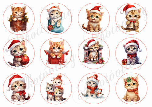 Aranyos kiscicák mikulássapkában 6 cm körökben - Több mint 20 alapanyagon elérhető.