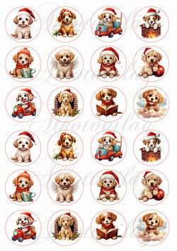Aranyos kiskutyák mikulássapkában 4 cm körökben - Több mint 20 alapanyagon elérhető.