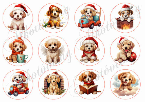 Aranyos kiskutyák mikulássapkában 6 cm körökben - Több mint 20 alapanyagon elérhető.