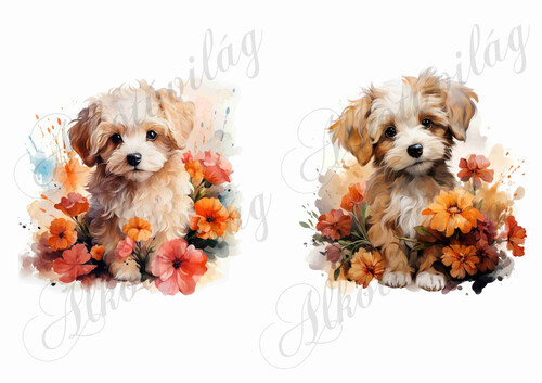 Bolognese, hawanese kutyusok virágokkal 2 - kb. 15 x 14,5 cm - Több mint 20 alapanyagon elérhető.
