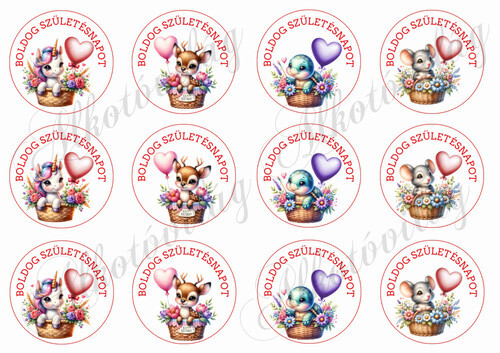 Cuki állatkák lufikkal 2 - BOLDOG SZÜLETÉSNAPOT felirattal 6 cm-es körökben - Több mint 20 alapanyagon elérhető.