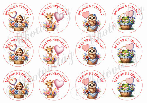 Cuki állatkák lufikkal 3 - BOLDOG NÉVNAPOT felirattal 6 cm-es körökben - Több mint 20 alapanyagon elérhető.