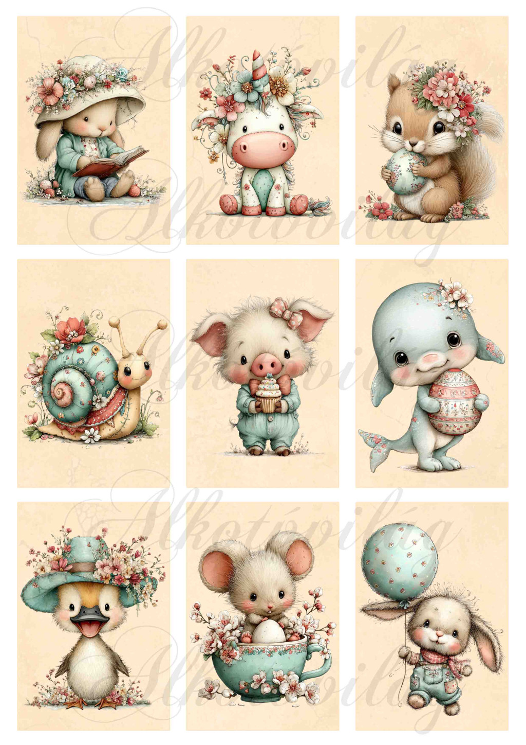 Cuki állatkák virágokkal sárgás alapon - 9 x 6 cm - HŰTŐMÁGNES, AJÁNDÉKKÍSÉGŐ készítéshez