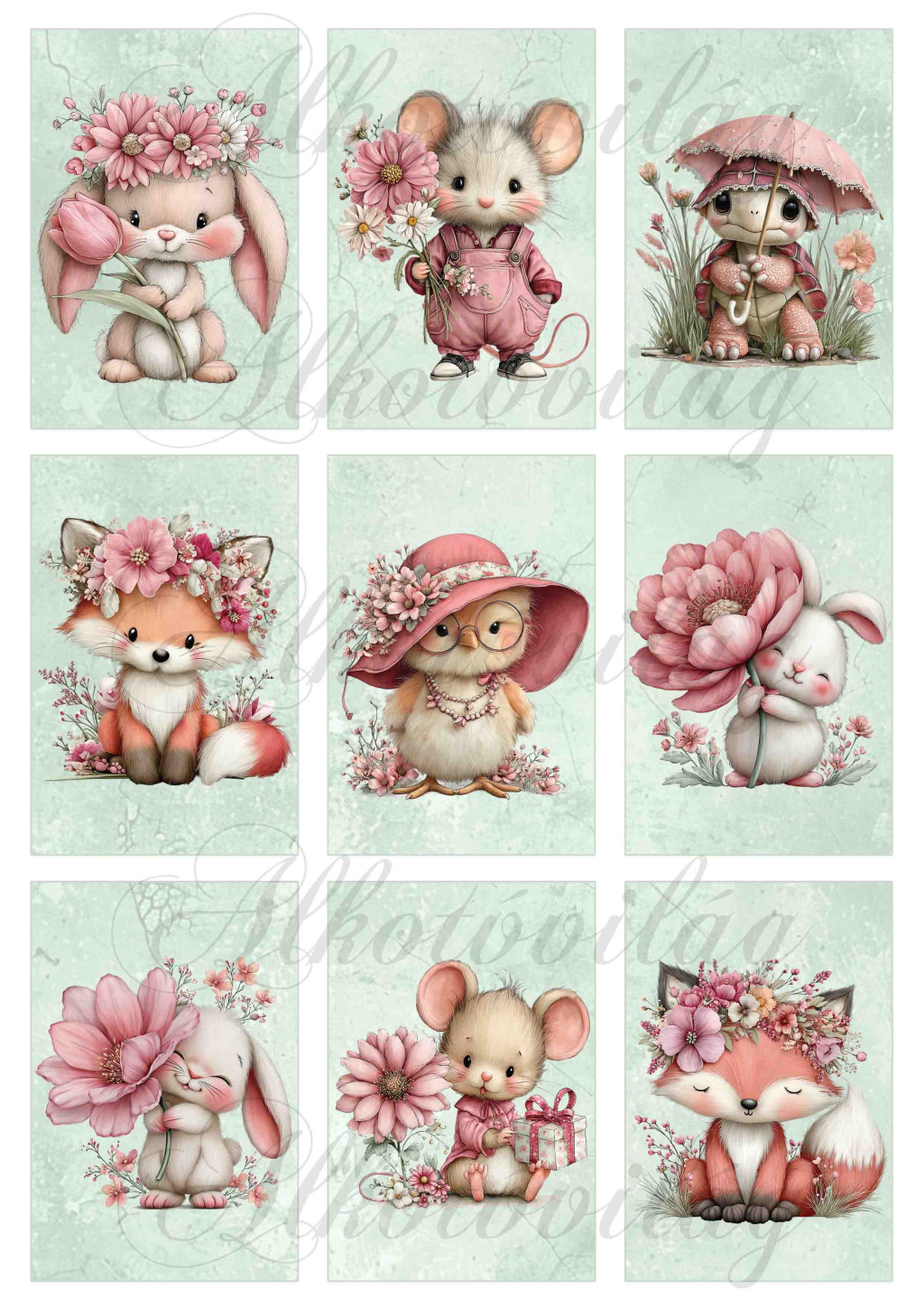 Cuki állatkák virágokkal zöld márványos alapon - 9 x 6 cm - HŰTŐMÁGNES, AJÁNDÉKKÍSÉGŐ készítéshez
