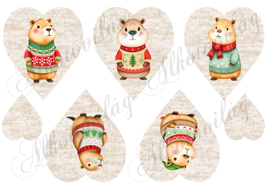 Cuki capybara-k karácsonyi kötött pulcsiban - 10 cm magas barnás - kötött szíveken