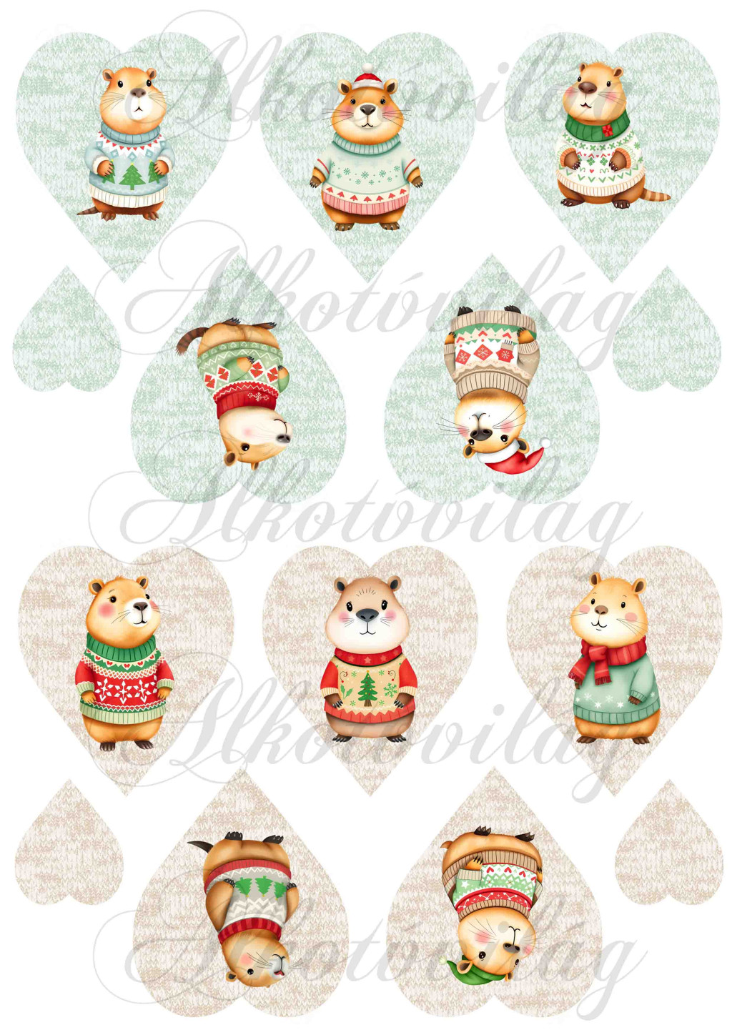 Cuki capybara-k karácsonyi kötött pulcsiban - 7 cm magas zöld és barnás - kötött szíveken