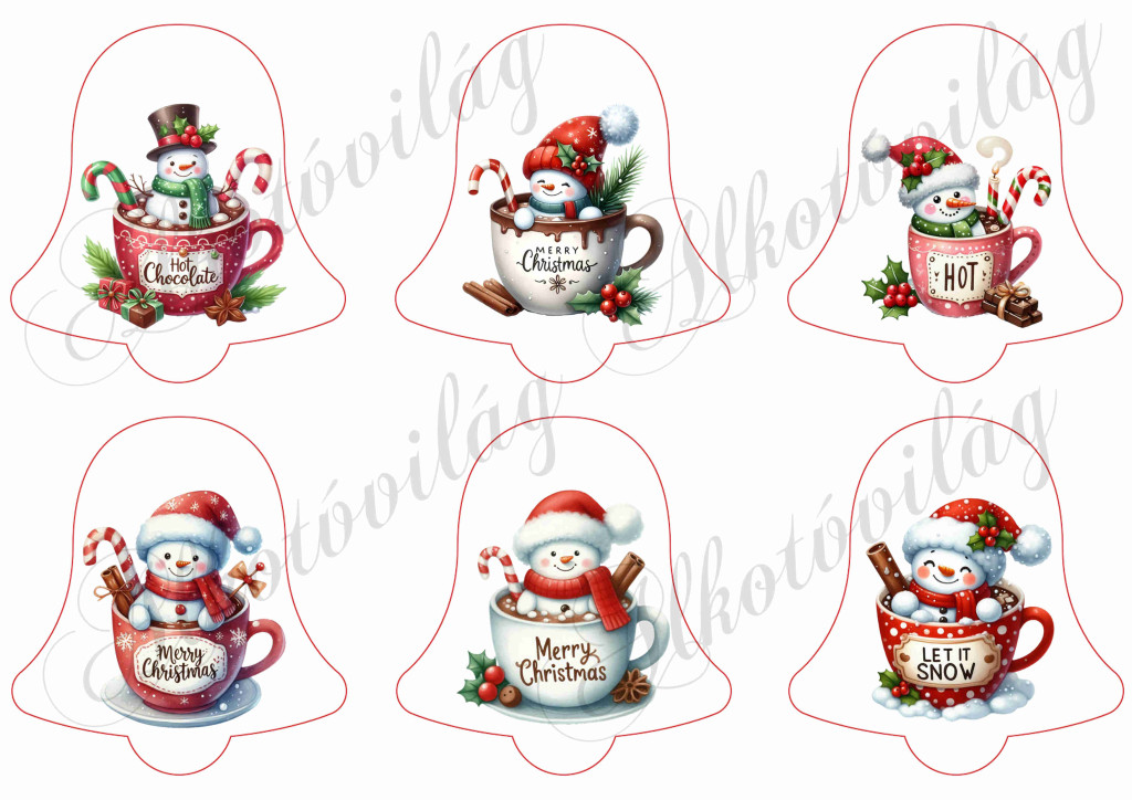 Cuki hóemberkék bögrékben - 9,5 cm magas harangokon - Több mint 20 alapanyagon elérhető.