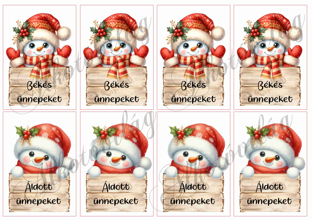 Cuki hóemberkék táblákkal és feliratokkal 10 x 7 cm-es téglalapokon