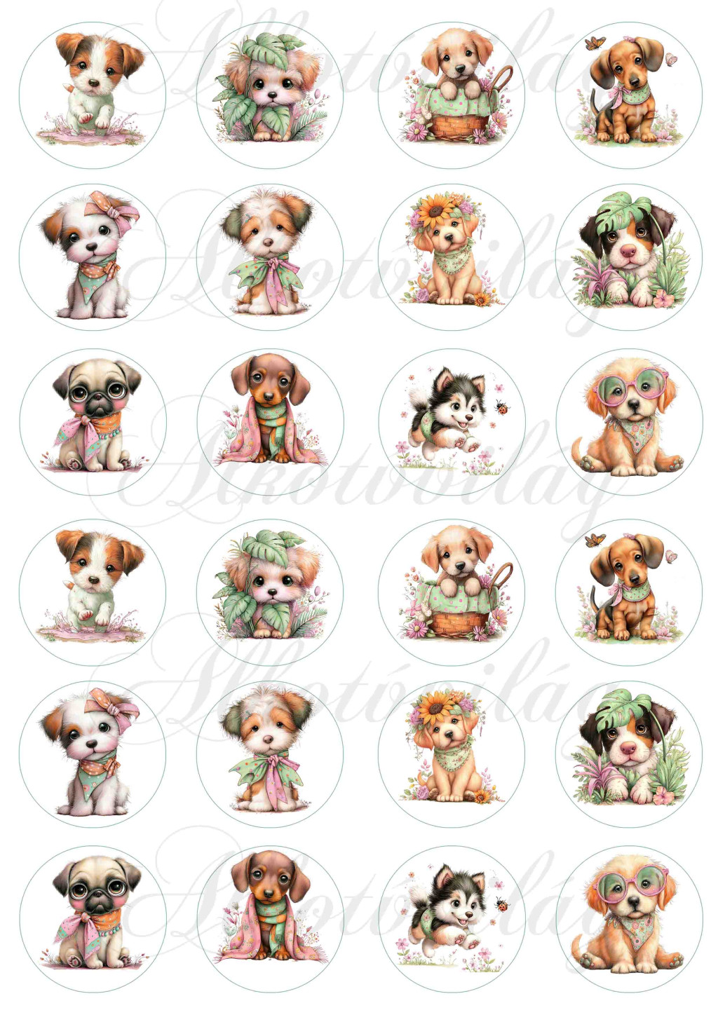 Cuki kutyusok virágokkal 4 cm-es körökben