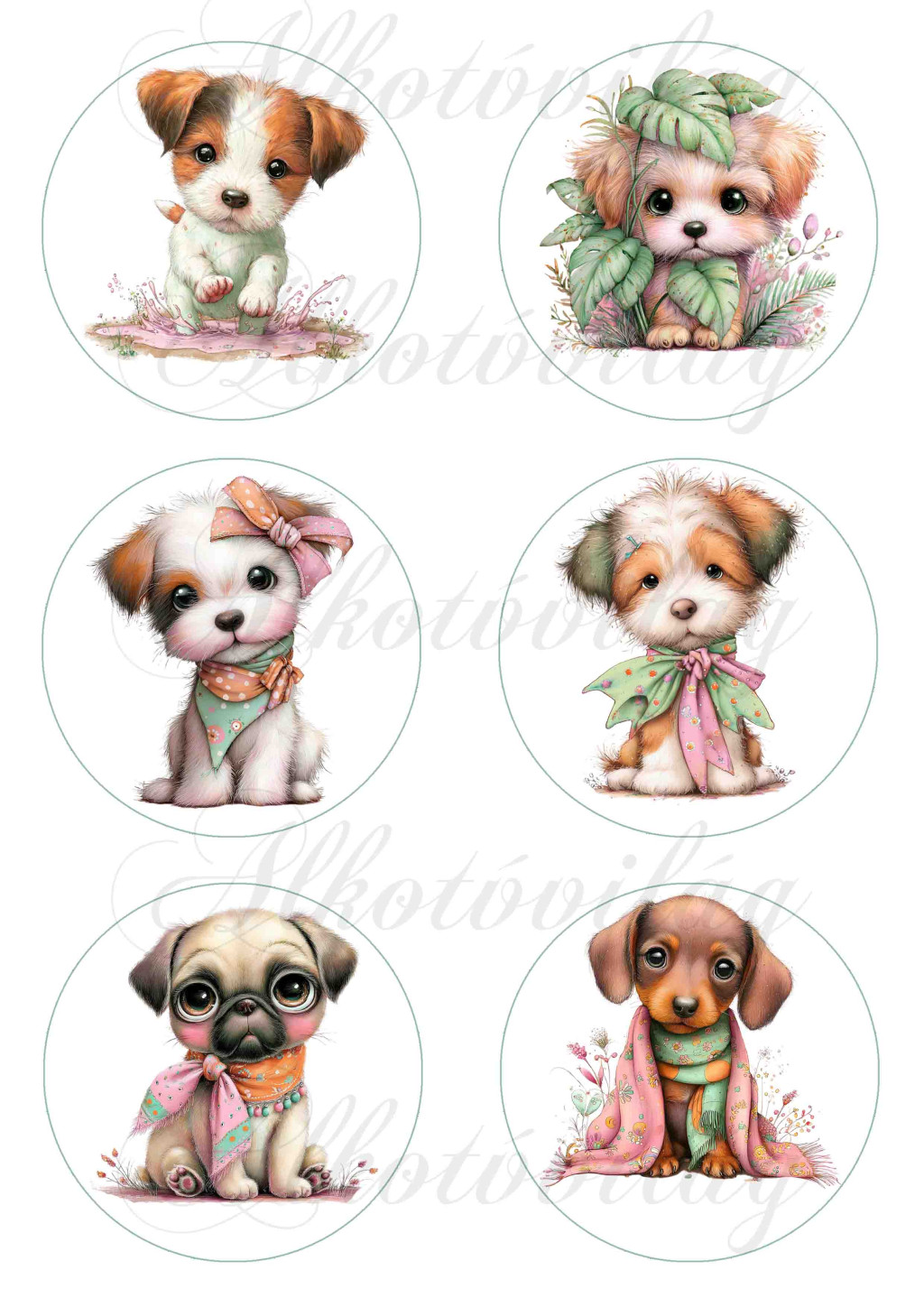Cuki kutyusok virágokkal 8,5 cm-es körökben 2. változat
