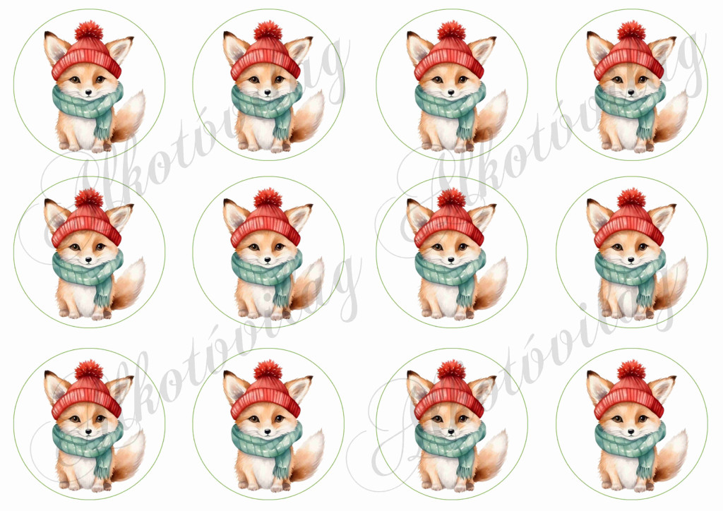 Cuki rókák piros sapkában és zöld sálban - 6,5 cm-es körökben