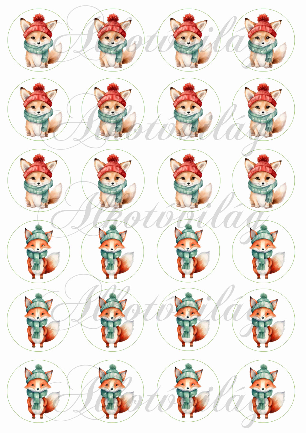 Cuki rókák piros-zöld sapkában és zöld sálban - 4 cm-es körökben