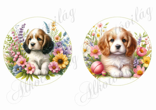 Cuki spániel kutyusok virágokkal - 13 cm átmérővel - Több mint 20 alapanyagon elérhető.
