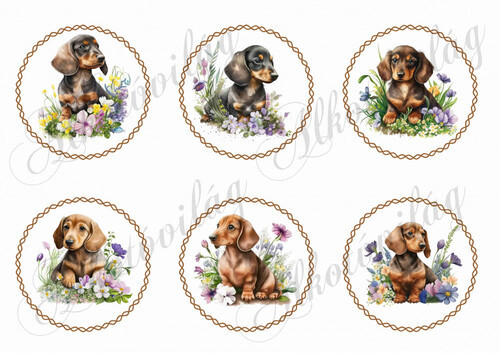 Cuki tacskó kutyusok virágokkal csavart körökben
