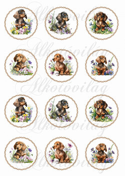 Cuki tacskó kutyusok virágokkal csavart körökben - KICSIBEN - Több mint 20 alapanyagon elérhető.