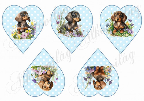 Cuki tacskó kutyusok virágokkal pöttyös szíveken
