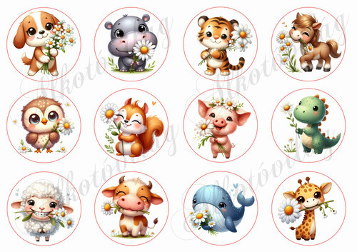 Cuki tavaszi állatkák százszorszép virágokkal 6 cm-es körökben