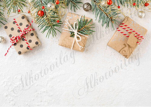 Fotóháttér  termékfotózáshoz - Natúr papíros ajándékdobozok fenyőágakkal