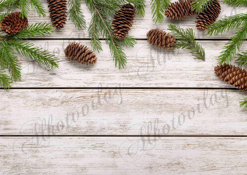 Fotóháttér termékfotózáshoz - Zöld fenyőágak tobozokkal, fa deszkákon - Több mint 20 alapanyagon elérhető.