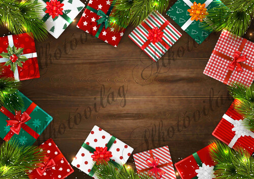 Fotóháttér termékfotózáshoz - ajándékcsomagok fenyőágakkal fa deszkákon - Több mint 20 alapanyagon elérhető.