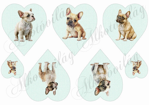 Francia bulldog kutyusok pasztell zöldes szíveken - Több mint 20 alapanyagon elérhető.