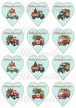 Karácsonyi autók pöttyös mentás szíveken BOLDOG KARÁCSONYT felirattal 5,7 cm magas - Több mint 20 alapanyagon elérhető.