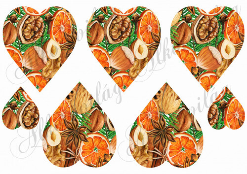 Karácsonyi hangulatú szívek narancskarikákkal, ánizs csillaggal, dióval, mogyoróval - Több mint 20 alapanyagon elérhető.