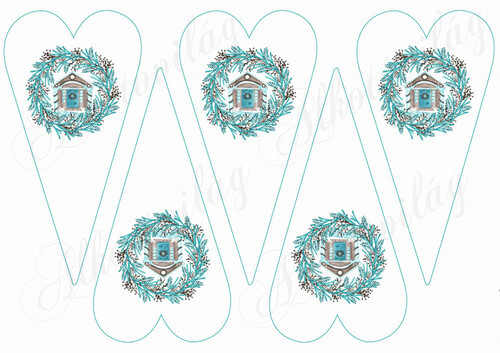 Karácsonyi mintás készlet kék-barna színekben - házikók koszorúkban hosszúkás szíveken - Több mint 20 alapanyagon elérhető.