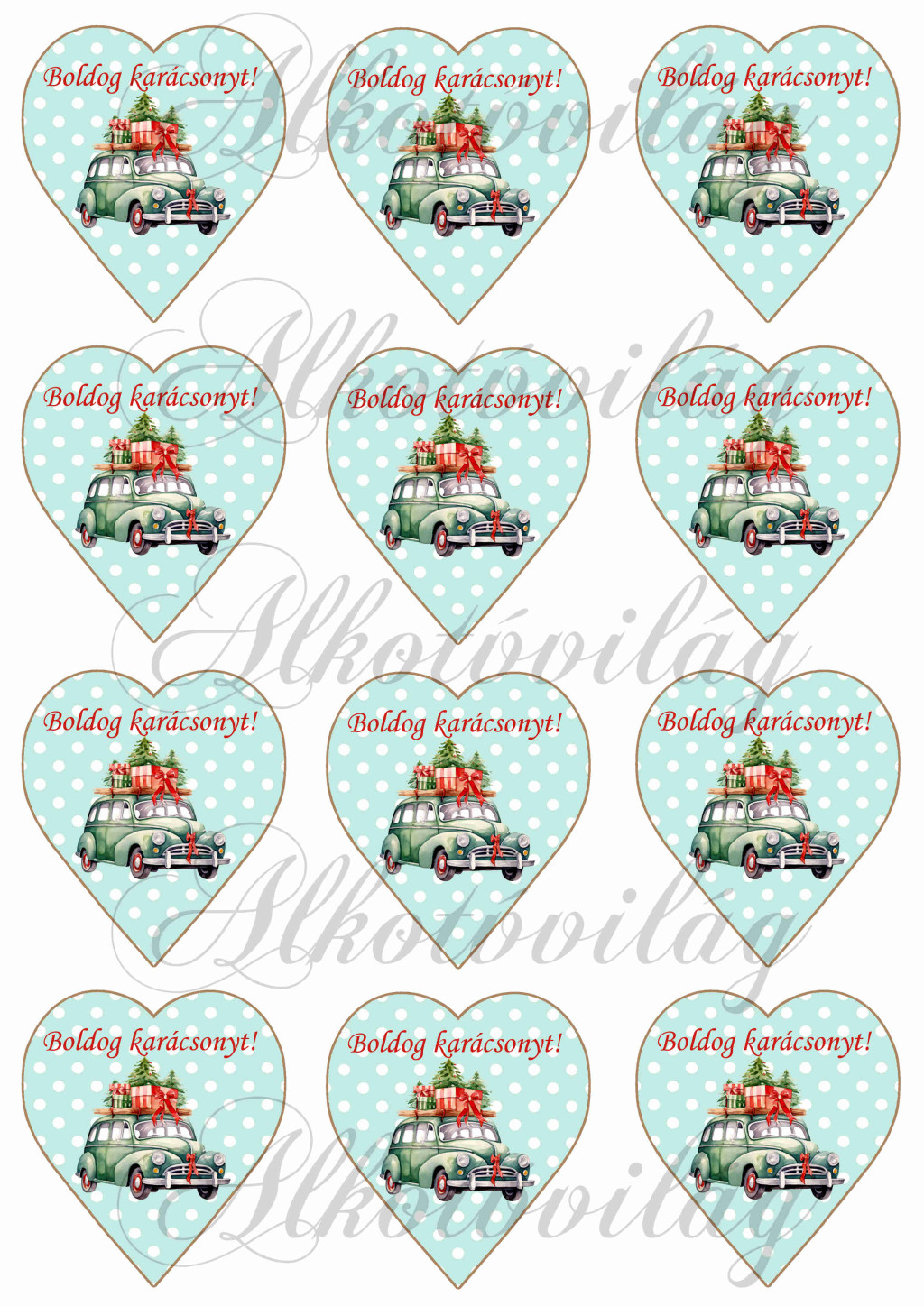 Karácsonyi vintage bogár autók mentás pöttyös szíveken - 6,7 cm magas - Több mint 20 alapanyagon elérhető.