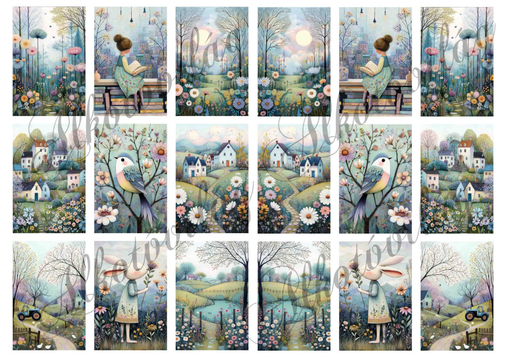 Kedves tavaszi hangulatú képek házikókkal, virágokkal - 6,5 x 4 cm - HŰTŐMÁGNES, AJÁNDÉKKÍSÉGŐ készítéshez