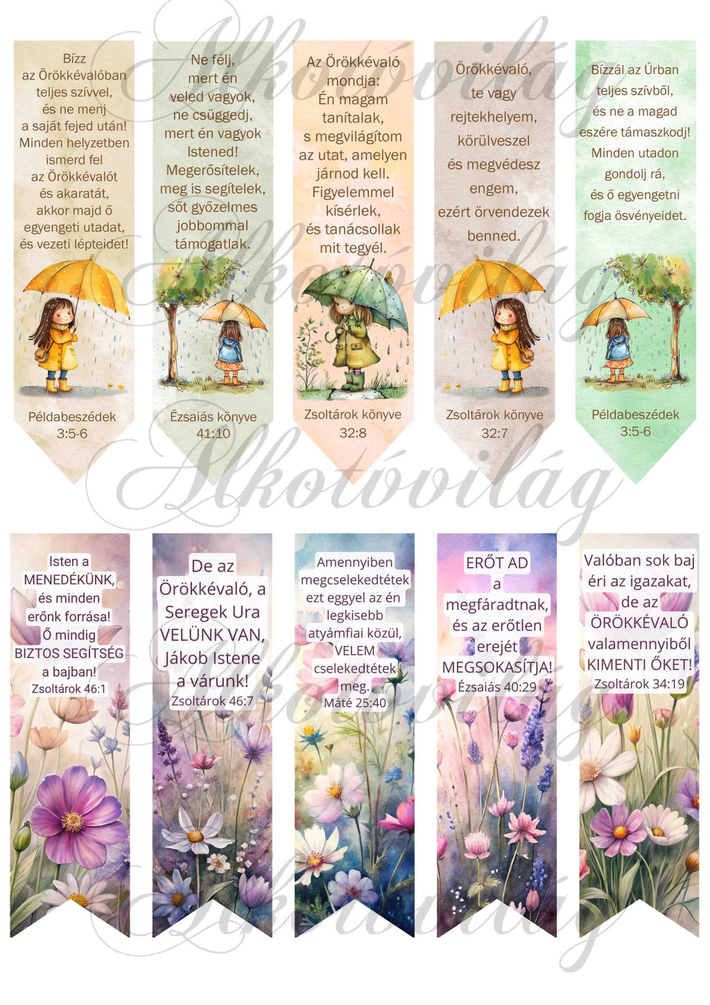 Könyvjelzők bibliai idézetekkel, virágokkal és esernyős kislánnyal - 12 x 3,5 cm