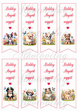 Könyvjelzők cuki kiskutyákkal, virágokkal - BOLDOG ANYÁK NAPJÁT felirattal - Több mint 20 alapanyagon elérhető.