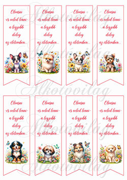 Könyvjelzők cuki kiskutyákkal, virágokkal - OLVASNI ÉS VELED LENNI... felirattal