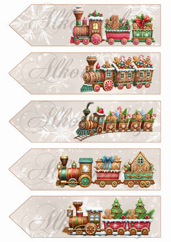 Könyvjelzők mézeskalács vonatokkal drapp hópelyhes alapon - 18,5 x 5 cm - Több mint 20 alapanyagon elérhető.
