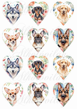 Kutyusok 6,5 cm magas szívekben - virágokkal - Több mint 20 alapanyagon elérhető.