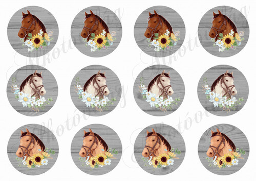 Lovak virágkoszorúkkal fa mintás kör alapon - Több mint 20 alapanyagon elérhető.