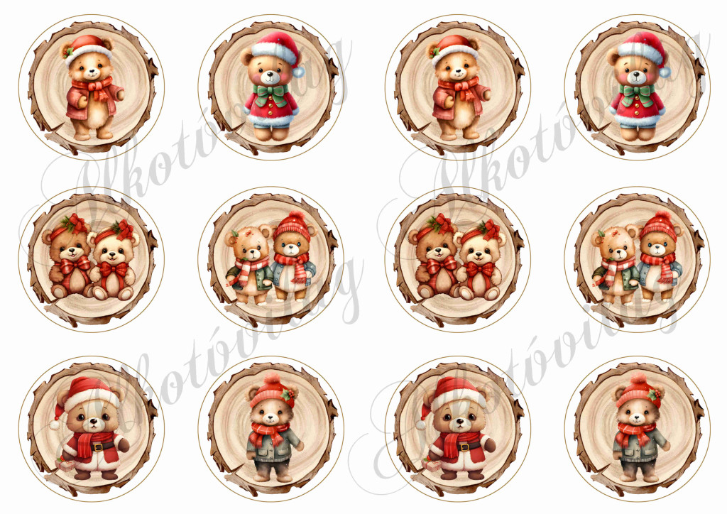 Mackók mikulássapkában fa korongokon -6 cm-es körökben - Több mint 20 alapanyagon elérhető.