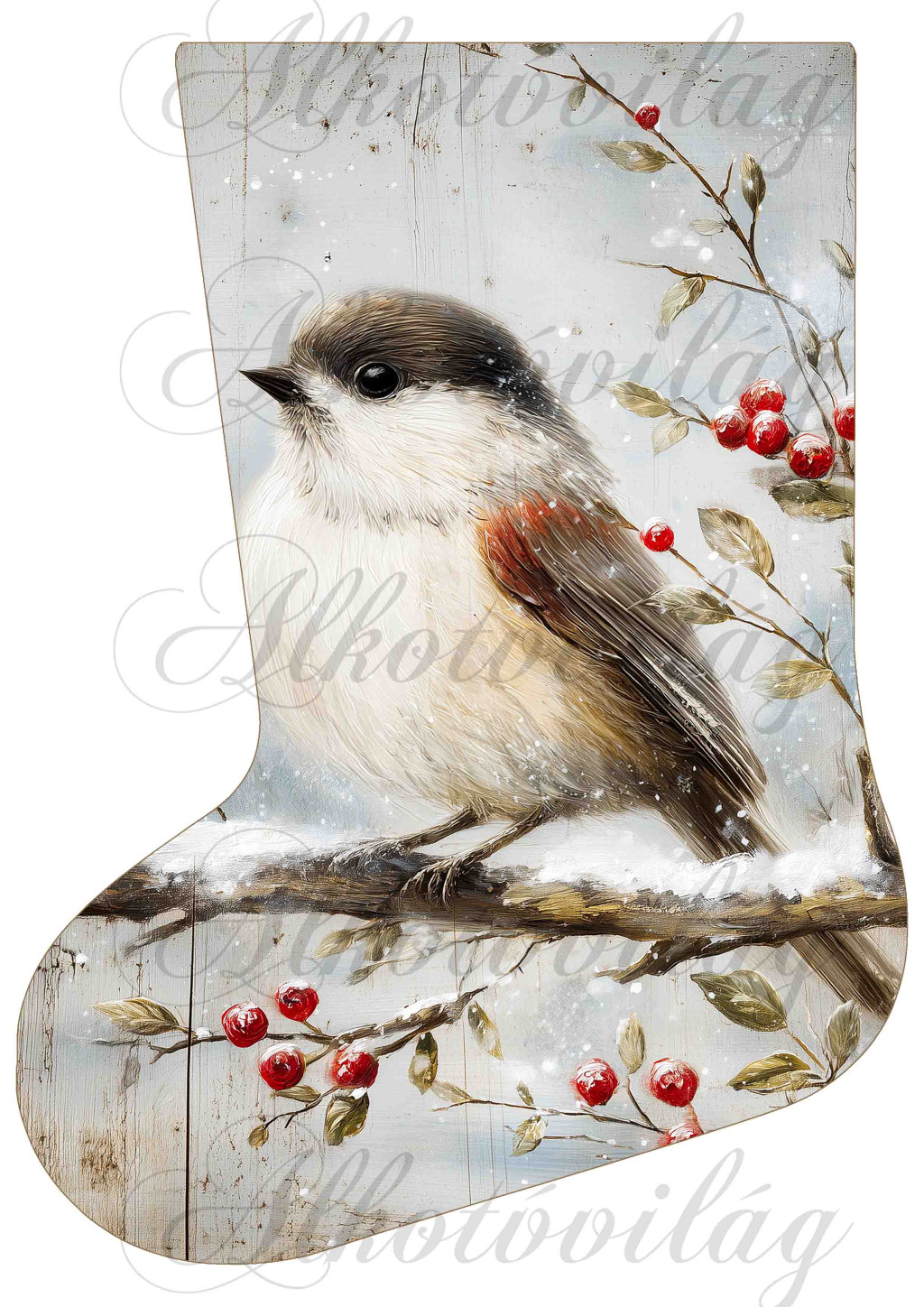 Mikuláscsizmák vintage karácsonyi hangulatban kismadárral, piros bogyókkal