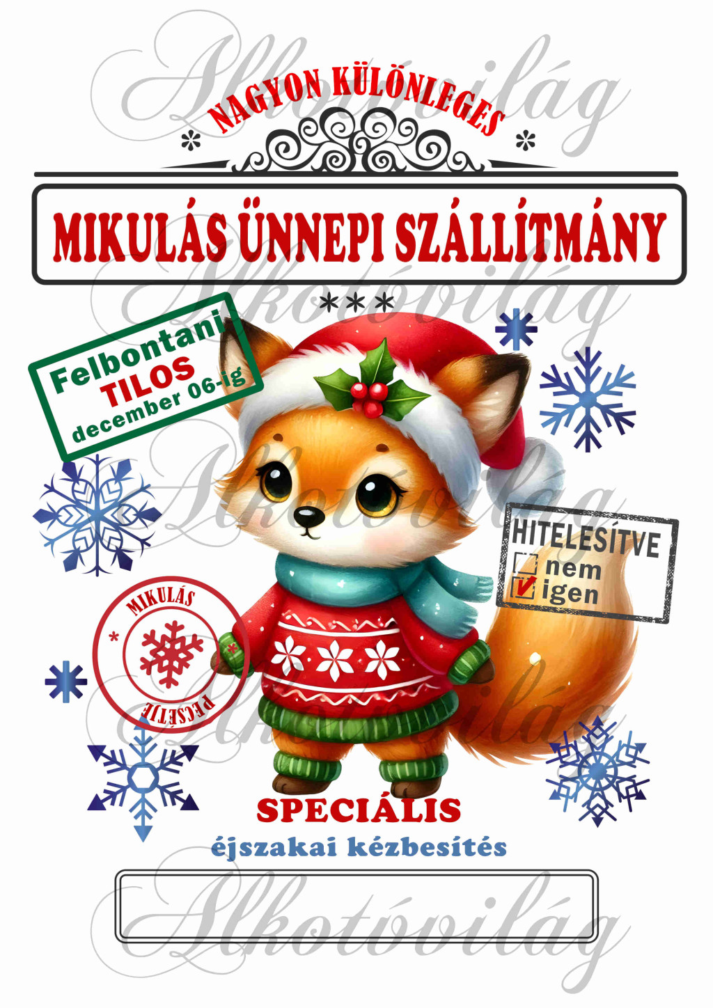 Mikulászsák ártatlan, aranyos róka karácsonyi ruhában, kék sálban - december 06-ra