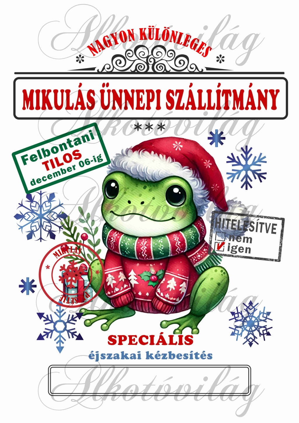Mikulászsák cuki, aranyos béka karácsonyi ruhában, nagy szemekkel - december 06-ra