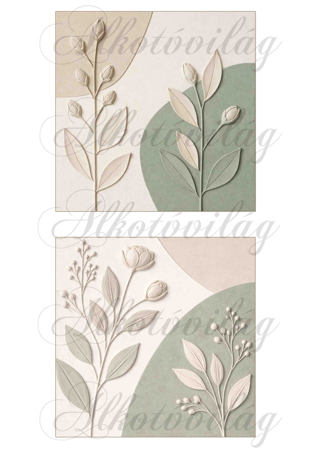 Minimal stílusú kép virágokkal, pasztell barna és zöld színekben - 14 x 14 cm