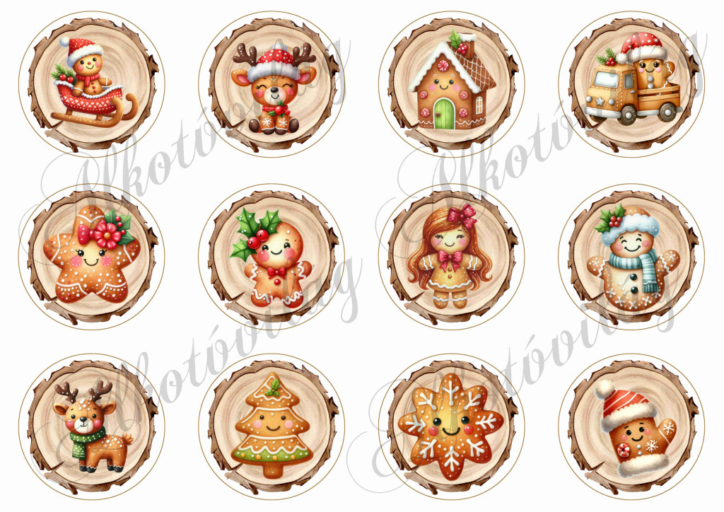 Mosolygós mézeskalács díszek fa korongokon -6 cm-es körökben - Több mint 20 alapanyagon elérhető.