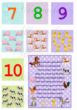 Oktató kártyák számokkal, állatokkal versikével - MÁSODIK OLDAL - Több mint 20 alapanyagon elérhető.