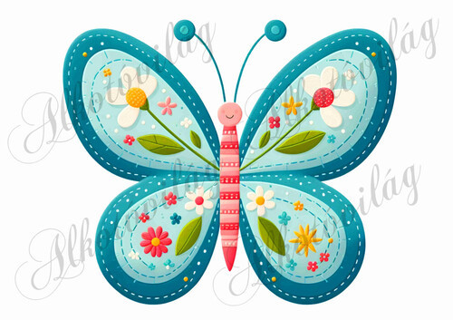Patchwork pillangó virágokkal türkiz-kékes árnyalatokban - kb. 18 cm magas - Több mint 20 alapanyagon elérhető.