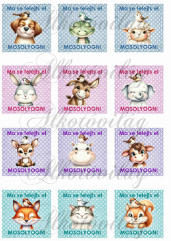Pöttyös négyzetek CUKI ÁLLATKÁKKAL, MA SE FELEJTS EL MOSOLYOGNI FELIRATTAL - 6X6 cm - Több mint 20 alapanyagon elérhető.