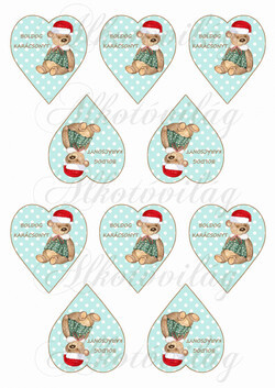 Pöttyös zöld szívek barna kerettel, mikulássapkás macival - BOLDOG KARÁCSONYT felirattal KICSIBEN - Több mint 20 alapanyagon elérhető.